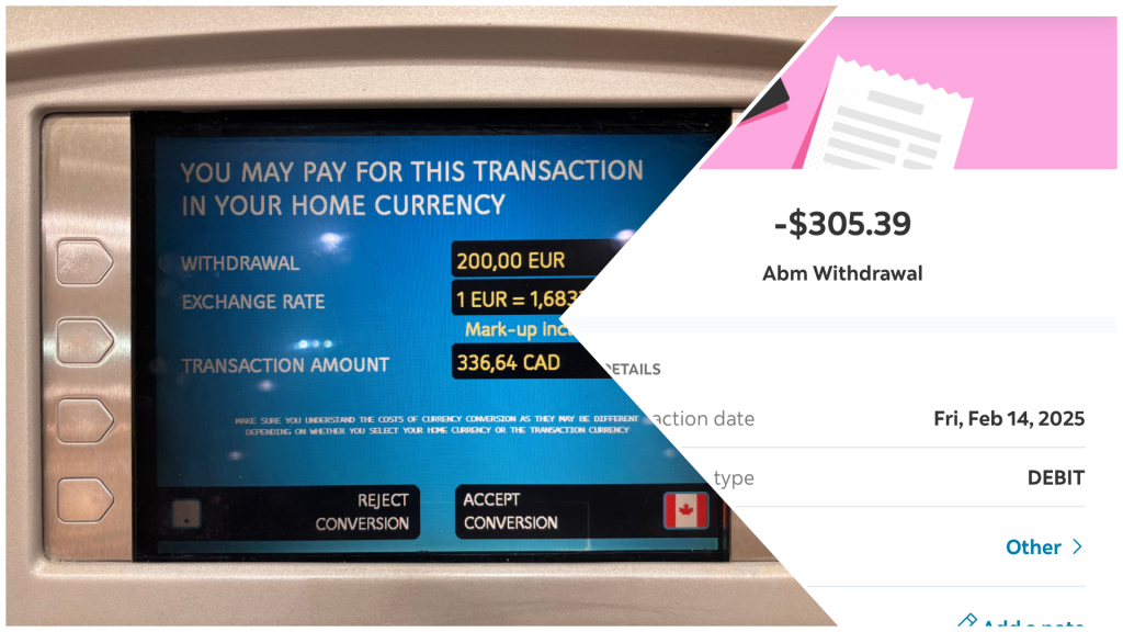 - Ao levantar 200 € num multibanco local, em 15 de fevereiro de 2025, o ecrã mostrava: “Pode levantar 200 € por 336,64 $ CAD (inclui um acréscimo de 13,5%). Deseja aceitar a conversão?”